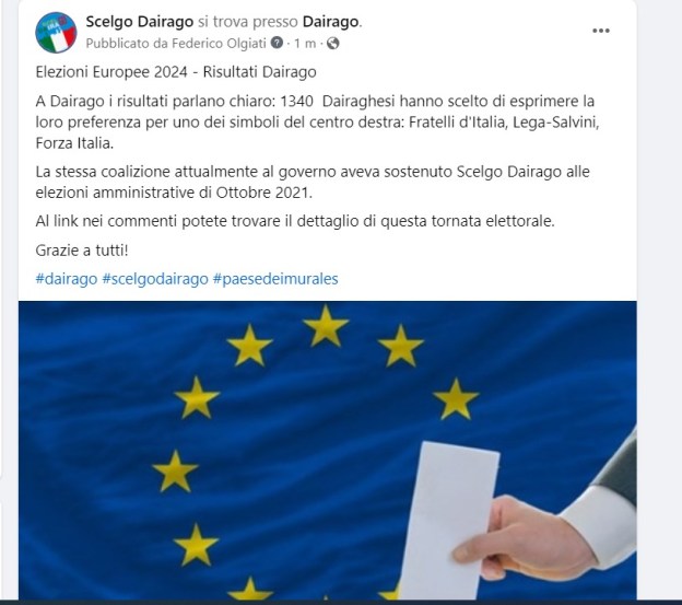 In un post del 25 Maggio 2024, un’associazione sportiva dairaghese, riguardo la manifestazione “Festa dello Sport” che si era svolta nella mattinata a Dairago, ringrazia la Consulta Sportiva, il Sindaco e tutte le Associazioni e le persone partecipanti.