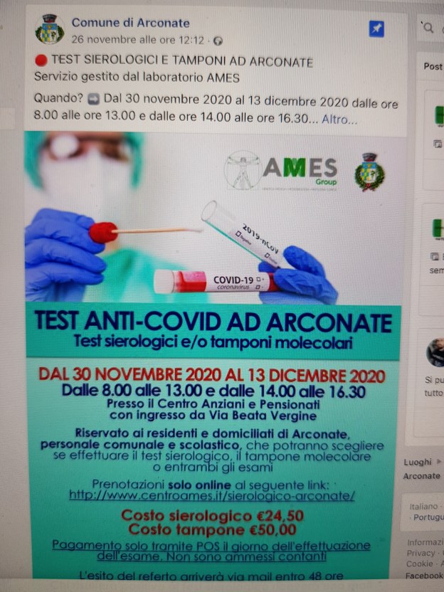 COVID: Test sierologici e tamponi ad Arconate dal 30 Novembre 2020 fino al 13 Dicembre 2020. E’ stato istituito il servizio gestito dal Laboratorio “AMES” dalle ore 8.00 alle ore 13.00 e dalle ore 14.00 alle ore 16.30. Possono partecipare i cittadini o domiciliati in paese, personale comunale e scolastico ed è su base volontaria (con la popolazione che può scegliere se fare il test sierologico con prelievo ematico e/o tampone molecolare). Tutto ciò presso il Salone polivalente del Centro Anziani e Pensionati. Per partecipare basta prenotarsi online. I costi sono 24,50 Euro per il Test sierologico e 50 Euro per il tampone molecolare.